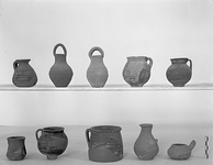 | Description: | Two joining and one non-joining fragment of upper wall and lip; partly restored in plaster. From a pot similar in shape to P 8512, etc. but glazed and provided with a single vertical handle. The rounded wall contracts to a narrow everted lip; the body with wheel ridges. Reddish-buff clay; dull, light reddish glaze on exterior and inside lip. | |