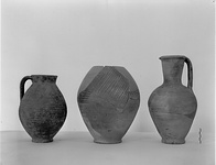 | Description: | Mended from several pieces. About half of body missing. Restored in plaster. Tall, slender ovoid body, ring foot. High spreading neck with thickened lip sloping to the exterior. Rim to shoulder handle. Grooves at lower handle attachment, at base of neck, on top of lip and on handle. Dark buff clay with bits; dull purplish-brown glaze on exterior to below shoulder. | |