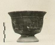 | Description: | Mended from three pieces. All of the rim is preserved intact, the lower part of the vase is missing; restored in plaster (on the basis of P 13071). Round Roman bowl with slightly flaring rim, with ridge at junction of rim and sides. At intervals scratched around the outside: <graphic> Buff clay; thin red wash inside and out. | |