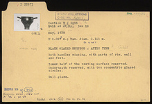 | Description: | Both handles missing, with parts of rim, wall and foot. Inner half of the resting surface reserved. Underneath reserved, with two concentric glazed circles. Dull glaze. Cf. Agora XII, no. 352. | |