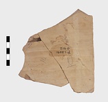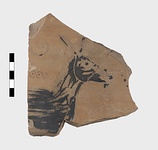 | Description: | Amphora fragment mended from two pieces. Slightly convex. Front part of donkey or mule to right; nostril, teeth and jawbone incised; white of eye reserved. Upper left, pendent spiral; below, row of open hooks and dots. To right, diagonal row of lozenges; below, filling ornament of zigzags. Pinkish-buff clay; black glaze, somewhat worn. | |