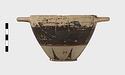 | Description: | Kotyle, mended from several pieces. Both handles, parts of rim, small pieces of body, restored in plaster. Low ring foot; rim curves slightly in. Rays from bottom to about one-third up. Above, solid glaze except in handle spaces. Traces of narrow white bands over the glaze; thin white line at rim; three concentric circles on underside. Light buff clay (greenish deposit on bottom?); glaze greenish to black, somewhat shiny. Protocorinthian. | |