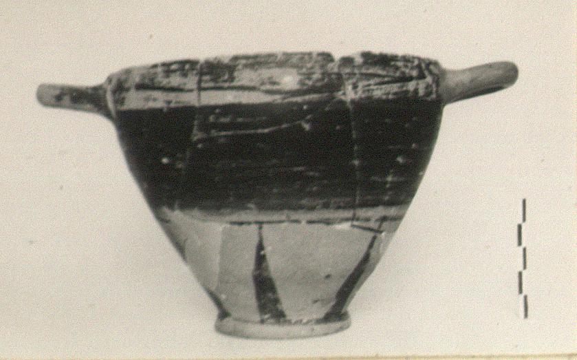 | Description: | Kotyle mended from many pieces. One handle and parts of body restored. Disk foot, very slightly concave. Slight omphalos on floor. Very irregularly made. Rays bound by narrow lines, above foot. Above, solid glaze to just below handles. Rim zone shows thin uneven glaze resembling worn glaze inside. Two white lines at bottom; one (perhaps two?) at top of solid zone (over glaze). Three concentric circles on bottom, the innermost solid. Pinkish-buff clay with impurities; black, rather shiny glaze. Attic imitation of Protocorinthian.§§ | |