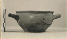 | Description: | Small skyphos, mended from many pieces. Large part of rim, one handle, missing. Restored in plaster. Flat base; shallow body. Slightly flaring rim. Pinkish-buff clay with small impurities; reddish-brown glaze, extremely worn. | |