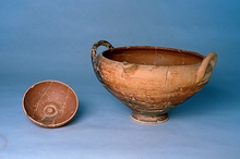 | Description: | Lekanis, complete except for small parts of lower body; restored in plaster. Deep, very pointed body somewhat warped below spout. Flaring ring foot. Walls taper below to a point inside the foot ring. Body bends in sharply at shoulder. Rim softly rounded on inside, has slight concavity on outside as if for cover. Horizontal rolled handles attached at shoulder rise vertically above rim. Bridged spout attached smoothly at rim and rising above rim. Glazed over all except for narrow uneven zone just above resting surface, underside of foot which has a broad glazed band inside ring, and a solid circle at center, and area between handles which has a wavy line of glaze in middle and a solid line below. Decoration in red and white over the glaze: white line in rim groove. Back handle zone divided into two broad panels by three vertical white lines which also set off handles. In each panel one white double spiral, the spiral-tops both attached to stem by loop zone, bordered below by two white lines enclosing a line of added purple. Third white line below handles. Corresponding front panels have a double M ornament drawn in red paint; the spout enclosed by red line. Farther down on body at broad, even intervals, three white lines: the middle one is not closed but overlaps under spout so as to be double; the lowest one at junction of foot and body. Pinkish buff clay, streaky red to black glaze; red glaze inside. | |