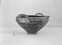 | Description: | Lekanis, complete except for small parts of lower body; restored in plaster. Deep, very pointed body somewhat warped below spout. Flaring ring foot. Walls taper below to a point inside the foot ring. Body bends in sharply at shoulder. Rim softly rounded on inside, has slight concavity on outside as if for cover. Horizontal rolled handles attached at shoulder rise vertically above rim. Bridged spout attached smoothly at rim and rising above rim. Glazed over all except for narrow uneven zone just above resting surface, underside of foot which has a broad glazed band inside ring, and a solid circle at center, and area between handles which has a wavy line of glaze in middle and a solid line below. Decoration in red and white over the glaze: white line in rim groove. Back handle zone divided into two broad panels by three vertical white lines which also set off handles. In each panel one white double spiral, the spiral-tops both attached to stem by loop zone, bordered below by two white lines enclosing a line of added purple. Third white line below handles. Corresponding front panels have a double M ornament drawn in red paint; the spout enclosed by red line. Farther down on body at broad, even intervals, three white lines: the middle one is not closed but overlaps under spout so as to be double; the lowest one at junction of foot and body. Pinkish buff clay, streaky red to black glaze; red glaze inside. | |