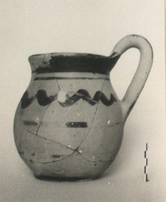 | Description: | Mended from many pieces. Large part of front of body restored in plaster. Round mouth. Rolled handle, attached at rim and rising above it. Low disk foot. Round body. Broad and heavy band of glaze on and below rim. Narrow band just below rim, two others on body and one just above foot. Band inside below rim. Heavy line on handle meeting inside band. Inside otherwise unglazed. Pinkish-buff clay with impurities. Uneven heavy glaze, worn in places. | |