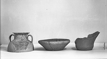 | Description: | Mended from many pieces; small parts of body restored in plaster. Broad slightly concave resting surface. Flaring sides; rim rolled, set off from sides by groove. Pinkish-buff clay with many impurities. Heavy fabric. Flinty grit over grinding surface, ground away in center. | |