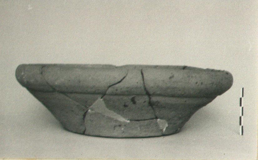 | Description: | Mended from many pieces; small parts of body restored in plaster. Broad slightly concave resting surface. Flaring sides; rim rolled, set off from sides by groove. Pinkish-buff clay with many impurities. Heavy fabric. Flinty grit over grinding surface, ground away in center. | |