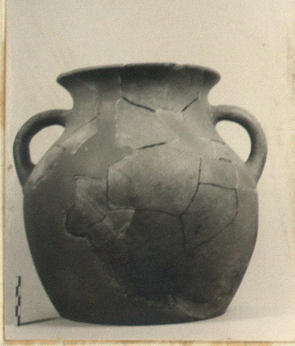 | Description: | Mended from many pieces. Part of rim, handle, most of lower body and foot, restored in plaster. Round body; short curved neck; flaring rim, slightly flattened top. Rolled handles. Lower attachments show round break in wall where lower handles were pressed in and thumb prints on outside. Pinkish gritty clay, burnt in spots both inside and out. Surfacing preserved. Handmade. | |