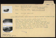 | Description: | Mended from four pieces; nearly half the rim missing, including part of one handle. High foot ring, its sides sloping outward. Lug-like horizontal handles, grooved. Three grooves around the top, and one around the bottom of the rim, which has a floral decoration in white paint. Clay coarse, pinkish buff, slightly micaceous. Purple brown glaze inside, on keeled rim, and part way down outside walls. Late Roman D. | |