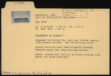 | Description: | Fragment including rim, wall and bottom, mended from several pieces. One non-joining piece. Almost vertical wall very slightly flaring. Rounded plain rim; flat resting surface. Heavy, coarse, buff fabric; surfaces covered with marks (of straw packing?). | |