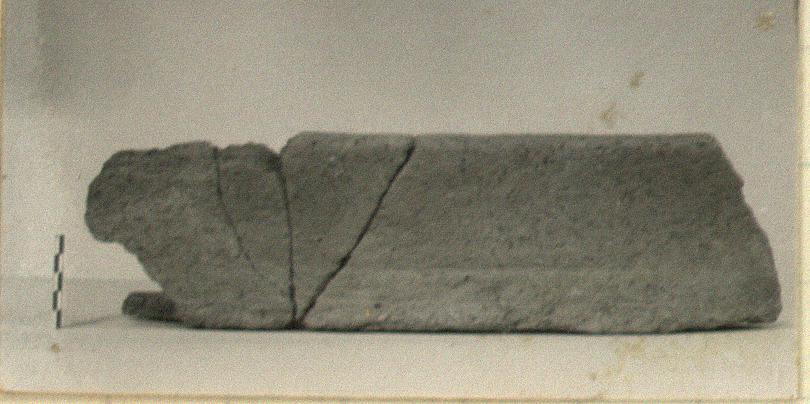 | Description: | Fragment including rim, wall and bottom, mended from several pieces. One non-joining piece. Almost vertical wall very slightly flaring. Rounded plain rim; flat resting surface. Heavy, coarse, buff fabric; surfaces covered with marks (of straw packing?). | |