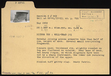 | Description: | Pithos top: several joining pieces preserve less than half of rim, height of neck. Several small non-joining fragments. Concave neck; thickened rim, slightly rounded on top and flattened on outside. Near base of neck, two heavy ridges, on which diagonals have been cut by a sharp instrument, the lower row reversing the direction of the upper. Pinkish-buff gritty clay. Heavy fabric. | |