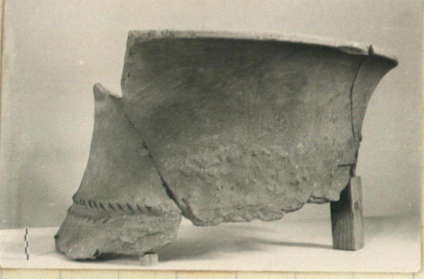 | Description: | Pithos top: several joining pieces preserve less than half of rim, height of neck. Several small non-joining fragments. Concave neck; thickened rim, slightly rounded on top and flattened on outside. Near base of neck, two heavy ridges, on which diagonals have been cut by a sharp instrument, the lower row reversing the direction of the upper. Pinkish-buff gritty clay. Heavy fabric. | |