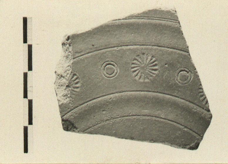 | Description: | From the floor of a plate. Alternating rosette and concentric circles. Hard red clay; orange-red glaze on inside. African red slip ware. Cf. P 27178, same vessel? | |
