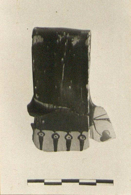 | Description: | Three joining fragments preserve vertical strap handle, perhaps from a kantharos. Black glaze on handle and inside; base of handle on outside reserved with "fringe" in black. Ivy vine on bit of side of bowl. ADDENDA Cf. P 24001 (Τ 2978), from well to north of Nymphaeum, from the same or a very similar pot. | |