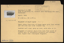 | Description: | Small piece from side of heavy basin with flat bottom and low side wall with rounded top. Reddish-buff clay, gray at core, with bits in it. Fragment of similar basin from late fill south of church sent to unnumbered household pot storage. Wall higher than catalogued fragment. | |