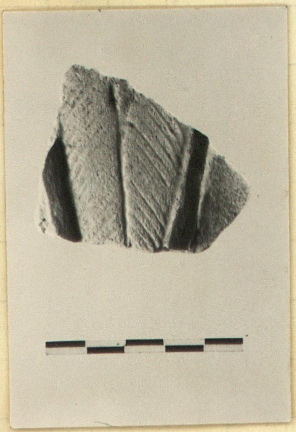 | Description: | Broken all around. The spines of two leaves are preserved in dark color against the ribbing in low relief; a bit of green relief is visible between the leaves at the top. From the side of a deep bowl of Megarian type as Tarsus I, fig. 132, no. 183. H.A.T. | |