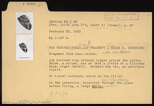 | Description: | Fragment from near center. Low molded ring between ridges around the center. Below, a column, and at left a little of a filleted head right (Eros?). Between the two, an uncertain object. No relief contours; white on the fillet. On the underside, scratched through the glaze before firing, a large Δ or Α. Cf. P 5711. | |