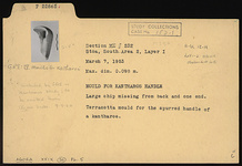 | Description: | Large chip missing from back and one end. Terracotta mold for the spurred handle of a kantharos. | |