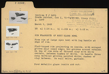 Description:   From rim of large open bowl with lug handle at edge of rim. Flat-topped rim projecting on inside, with scraped groove near inner edge; two grooves around outside. On top of rim, dots of thinned clay with white centers, between dashes of white. On handle, three deep vertical grooves painted white; dashes of clay between. On wall below, garland.