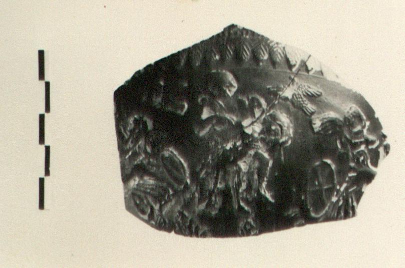 | Description: | Two joining wall fragments broken all around. At bottom, tips of widely spaced leaves preserved; at top, a band of pendent leaves with dots above. In center, a seated figure with a nude figure across his knees. At left, a bearded figure driving left in a chariot. At right, a winged figure driving right in a chariot. Two birds in field. Pinkish-buff clay. Somewhat metallic glaze, worn in places. | |