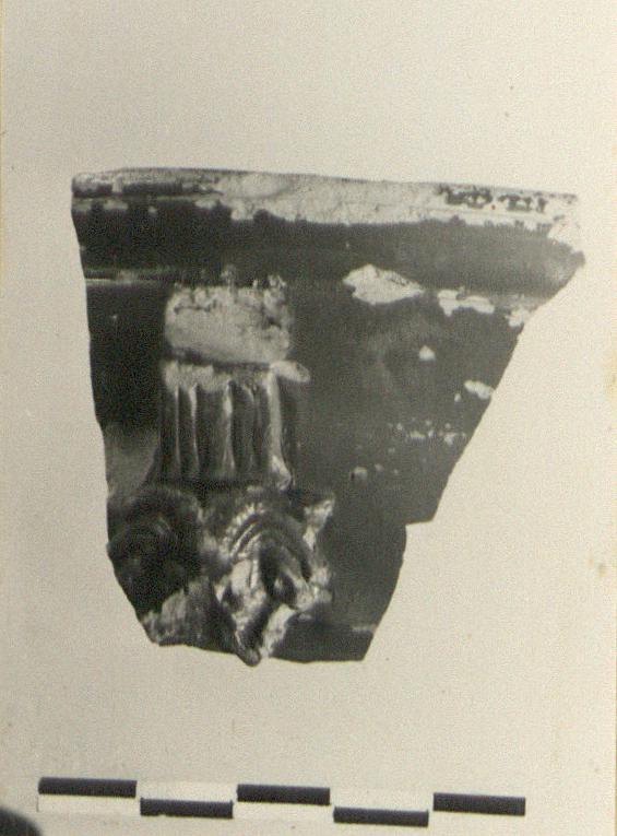 On side, in relief, a head with horns (Jupiter Ammon?); uncertain object, partly broken away, above the head.