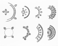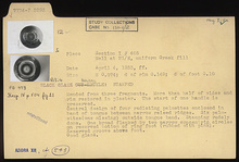 Description:   Mended from three fragments. More than half of sides and rim restored in plaster. The start of one handle is preserved. Central design of four radiating palmettes enclosed in band of tongue between narrow raised ridges. Six palmettes (one missing) outside tongue band. Stamping rudely done. One broad, flanked by two narrow, concentric circles on reserved bottom of ring foot (rubbed with pink). Reserved groove above foot.