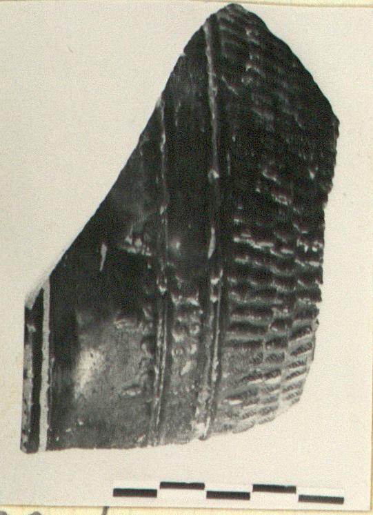 | Description: | Rim and wall fragment mended from two pieces. Rim a little out-turned, set off by a groove. Below: zone of palmettes on spirals and another with guilloche. Around wall: rows of very small leaves, roughly indicated. Pinkish-buff clay. Dull, slightly metallic glaze. | |