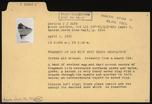 A band of moulded egg and dart around center of fragment with decorated surfaces above and below. Above: a kernos in very heavy added clay with a branch through the handle and another to left. Below: an indeterminate object in added clay.