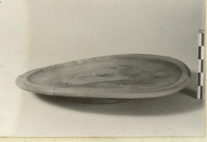 | Description: | Mended from two pieces. A flat plate, badly warped in making. Low ring foot, grooved on resting surface; two grooves around underside and a broad groove on the plain rounded rim. Thin dull glaze wash on the floor, and some remains of glaze on the underside; the top of the rim reserved. | |