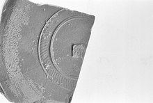 | Description: | Samian B plate fragment. Very low moulded ring base. In the center of the inside, a circular hatched band, within which is an oblong stamp: <graphic> | |
