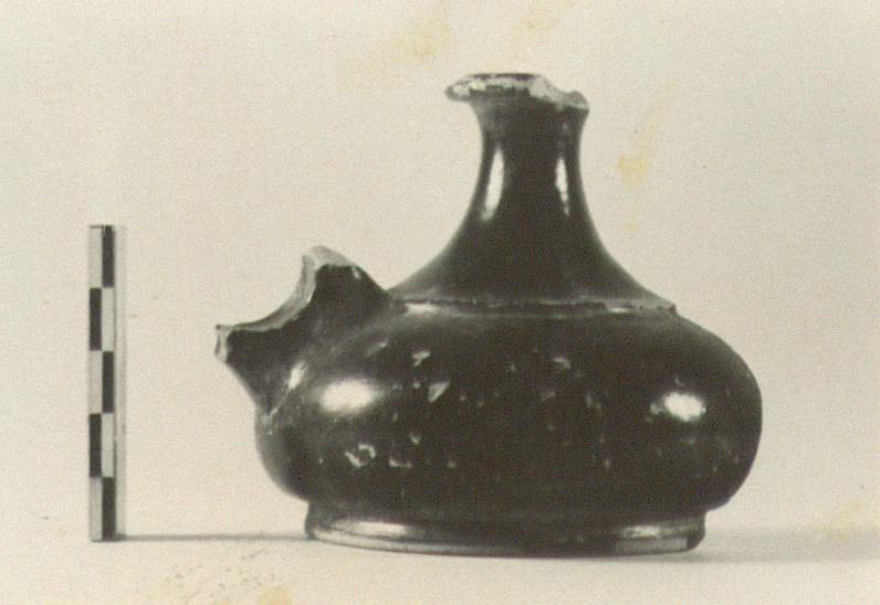 | Description: | About half preserved; the handle broken off, and most of the lip. Plump spreading body with offset at shoulder; narrow neck; out-turned lip; ring foot. Inscribed beneath, within foot. Good metallic black glaze all over except on underside. | |