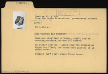 Description:   Head and shoulders of woman, right; peplos, earring, necklace, knitted(?) sakkos. No relief contour. Added clay for ornaments; white for flesh; the dress once painted in an added color.