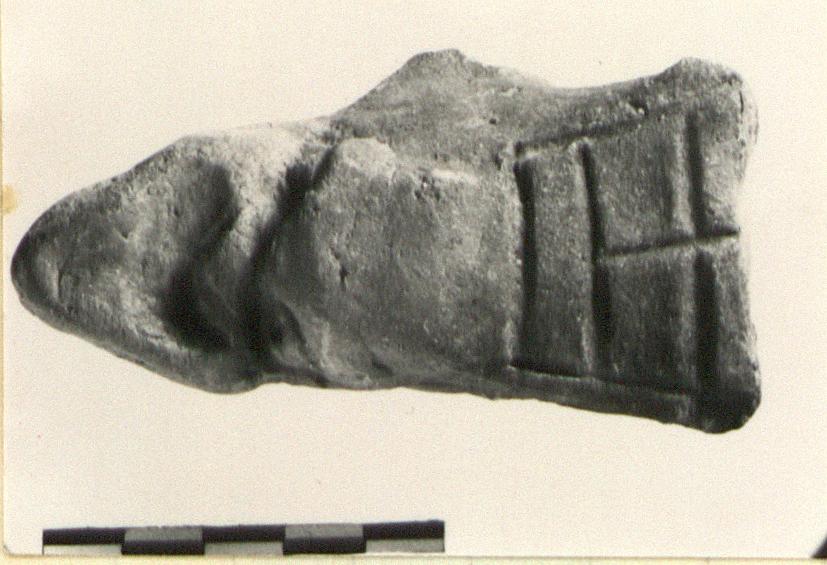 | Description: | Satyr head completely preserved. Oblong head of mask type having a trapezoid "hair dressing" decorated with incised cross and grooves at each side and below it. Coarse micaceous clay. Partly burned. | |
