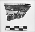 | Description: | a) Mended from two pieces. Bottom, most of lower part and small part of upper walls and rim preserved; complete profile given. Small rosette within wide groove in bottom medallion. Vertical grooves, alternately fluted and plain; their upper end recalls the "egg and dart" pattern. Scraped groove just below rim. Pink clay; dull glaze. b) Κ 4331: Middle Stoa building fill, lot 142. Non-joining rim fragment. One concave long rounded petal bordered by thin ridge, and tip of one pointed, ribbed lotus petal. Scraped groove below slightly out-turned rim. Shiny black glaze. c) Κ 4338: Hellenistic fill south of Middle Stoa and south of Drain C, lot 202. Wall fragment. Parts of two concave long petals, with ribbed petals between them. Shiny black glaze. d) Κ 4340: 25-26/ΛΑ-ΛΕ martyr. Cutting intermediate strosis (= ramp), to working floor. Rounded ribless petals alternating with pointed ribbed petals. Scraped groove below rim. Shiny black glaze, peeling somewhat. ADDENDA Restored in plaster with P 23766. Cf. Hesperia Suppl. 10 (1956), p. 90, n. 12; p. 91, n. 14. Cf. AJA (1941), pl. VII, nos. A 4, 7 and 8. ADDENDA Three additional fragments b), c), d) incorporated into reconstruction. | |