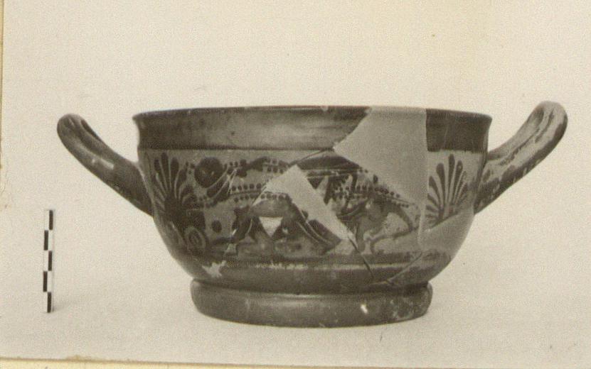 | Description: | Mended from several pieces; some missing wall pieces restored in plaster. A) Herakles and the lion; part of the middle of lion missing. B) Herakles and the lion; left half of the picture missing. Branches in the background. Inside of handles reserved. Bottom reserved with dot and concentric circles in glaze. Pinkish-buff clay; thin, flaked glaze fired brown-red. | |