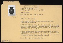 Description:   Small chip off lip, large fragment off foot, restored in plaster. Plain outcurving rim, flat handles, disk foot with narrow resting surface, sloping inner face, convex bottom. Two scraped grooves border a flat ring at the junction of the foot. Glazed except rim, profile and underside of foot. A couple of red lines at the level of lower handle attachment, passing actually over it; one red line at base of neck. Neck glazed inside.