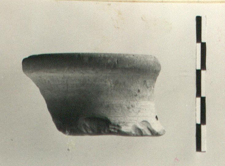 | Description: | About one-third preserved. Incurved profile; spreading more at one end. Red-brown clay, light at surface. Unglazed. Cf. MC 201. | |