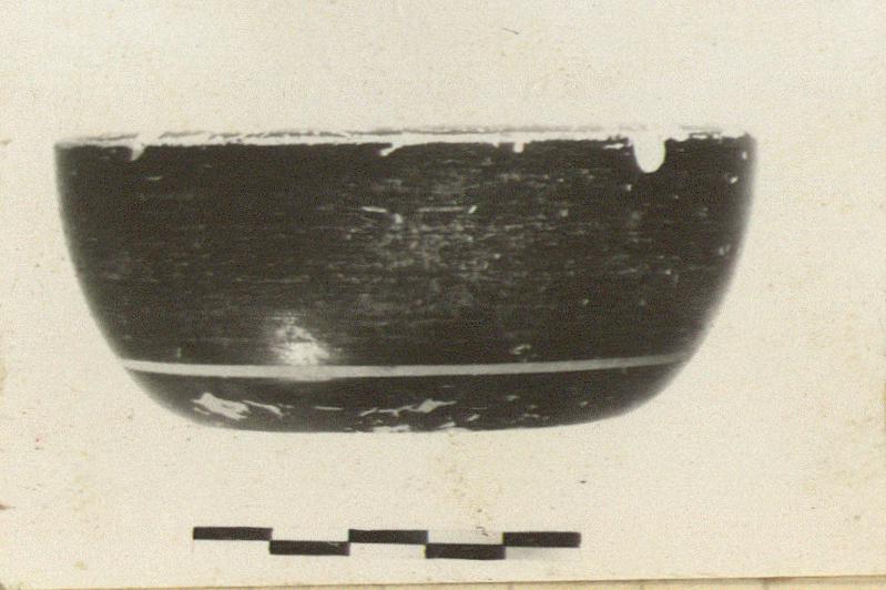 | Description: | Only half remains. Echinus-like profile; rim sloping down towards interior. Black glazed inside and out, with a narrow reserved line on upper wall outside. Good glaze worn on outside and resting surface. Pinkish-buff clay. | |