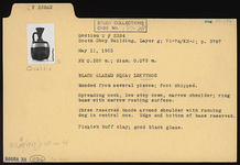 | Description: | Mended from several pieces; foot chipped. Ring base with narrow resting surface; squat body; narrow shoulder; spreading neck, low step down. Three reserved bands around shoulder with running dog in central one. Edge and bottom of base reserved. Pinkish-buff clay. Good black glaze. | |