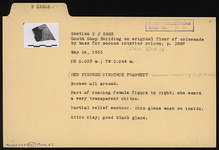 | Description: | Broken all around. Part of running female figure to right; she wears a very transparent chiton. Partial relief contour. Attic clay. Good black glaze. Thin glaze wash on inside. | |