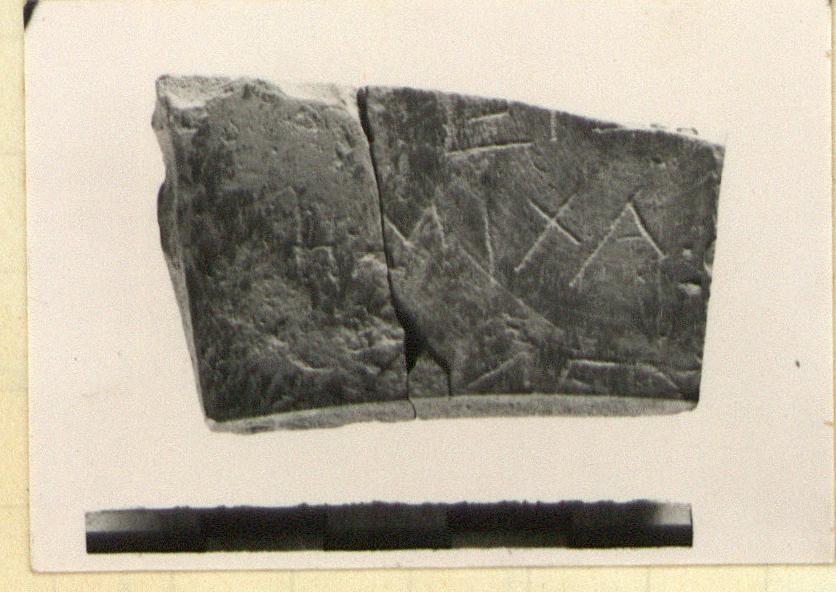 | Description: | Two joining sherds from a flat-bottomed saucer with thin red glaze on inside and out. Three lines of a graffito, of which original left ends preserved; broken at right; a list?: <graphic> | |
