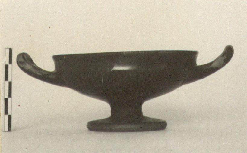 | Description: | Parts of rim and floor missing and restored. Very neatly made miniature. Handle spaces and insides of handles reserved; also edge of foot, and center of cone beneath. Good glaze, streaked red to black. | |