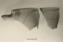 | Description: | Four joining fragments preserve about half the rim, with part of the neck, the upper part of one handle, and the upper attachment of the other; a second fragment preserves part of the other side of the neck, marked with a circular impression just below the rim. Bulging neck, rolled rim marked off from the neck by a red band. Sandy buff clay, grayish at core, with traces of surfacing and remains of waterproofing on the interior. | |