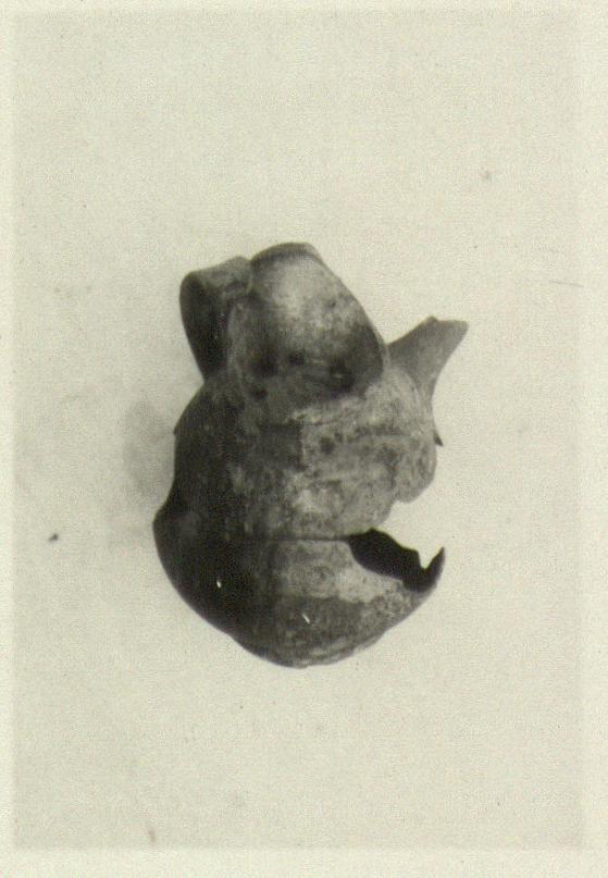 | Description: | Mended from several fragments. A good part of body walls and rim missing. Body like that of small amphora with greatest diameter below center. Low ring base. Mouth closed by strainer (eight holes around edge, solid center). From this, a high lip with profile like the flaring, incurving Hellenistic bowls. Ribbon handle, neck to shoulder. At a little less than right angles to this, a tapering spout, lip broken. Soft red clay. Remains of all-over black glaze, thin, brownish and mottled. Also glazed inside. | |