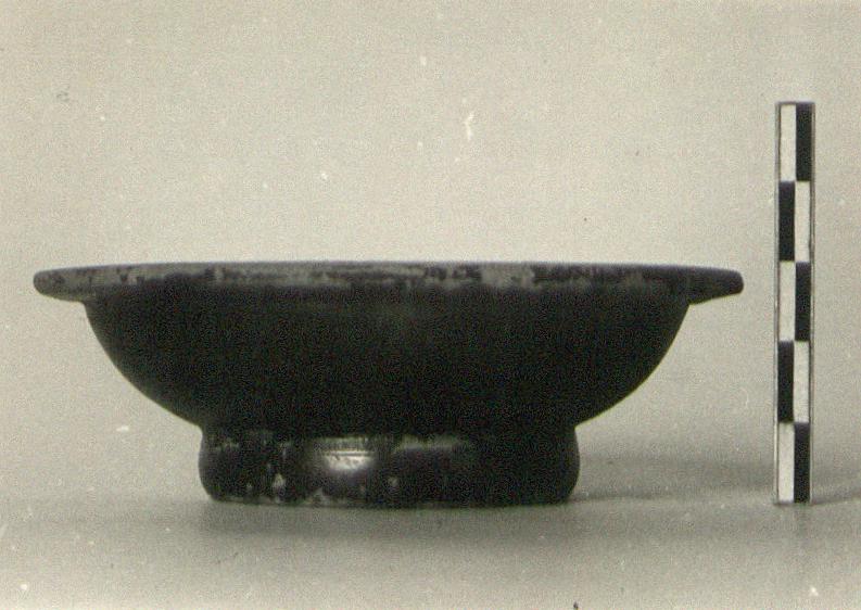 | Description: | Chips missing from rim. Small shallow dish on ring foot; broad flat-topped projecting rim; resting surface lightly grooved. Metallic black glaze overall, except on resting surface; somewhat chipped and flaked. Cf. Agora XII, no. 881. | |