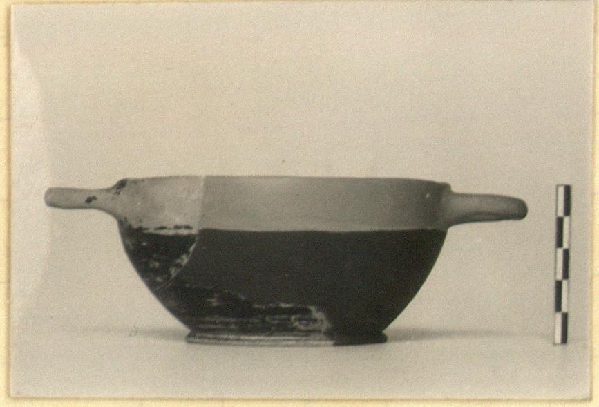 | Description: | Mended from several pieces; one handle, profile and foot preserved; restored in plaster. Low disk foot, concave beneath; low, rounded profile; handles just below rim. Two broad concentric glazed circles on underside. Handle zone reserved; below it, applied purple, bounded by white lines. Inside, just below rim, half way down and on floor, same decoration. Pinkish-buff clay. Glazed inside and out; much flaked black glaze. | |