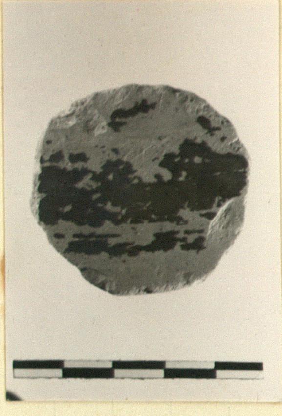 | Description: | Cut from wall of large closed pot; edges chipped. Once ornamented with a row of dots in an added color? Light pinkish-buff clay. On outside, thin grayish-black glaze, much worn. | |